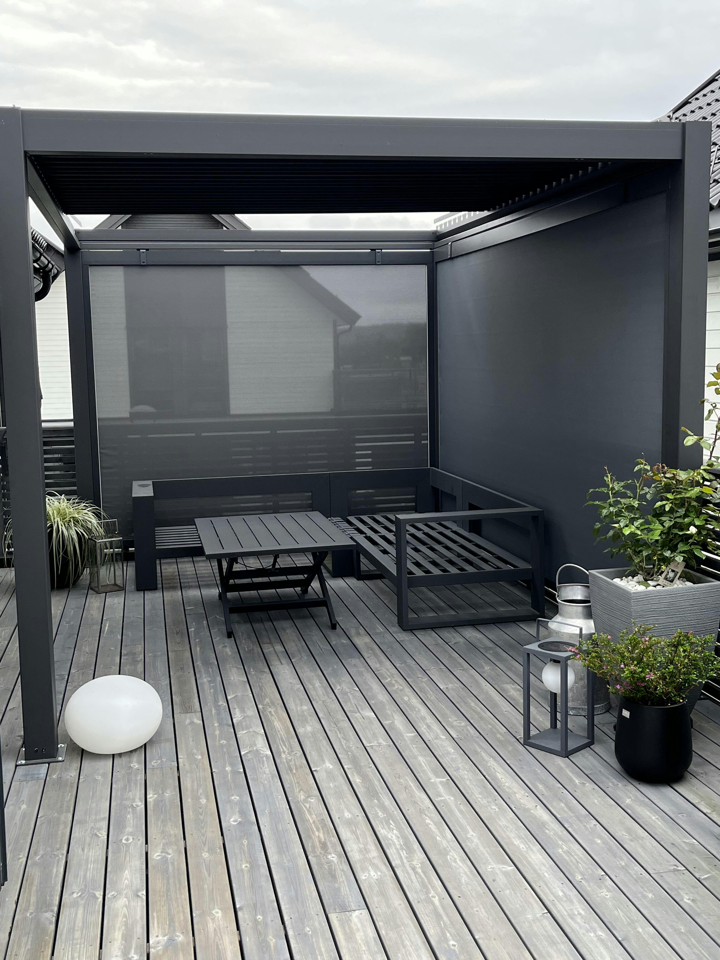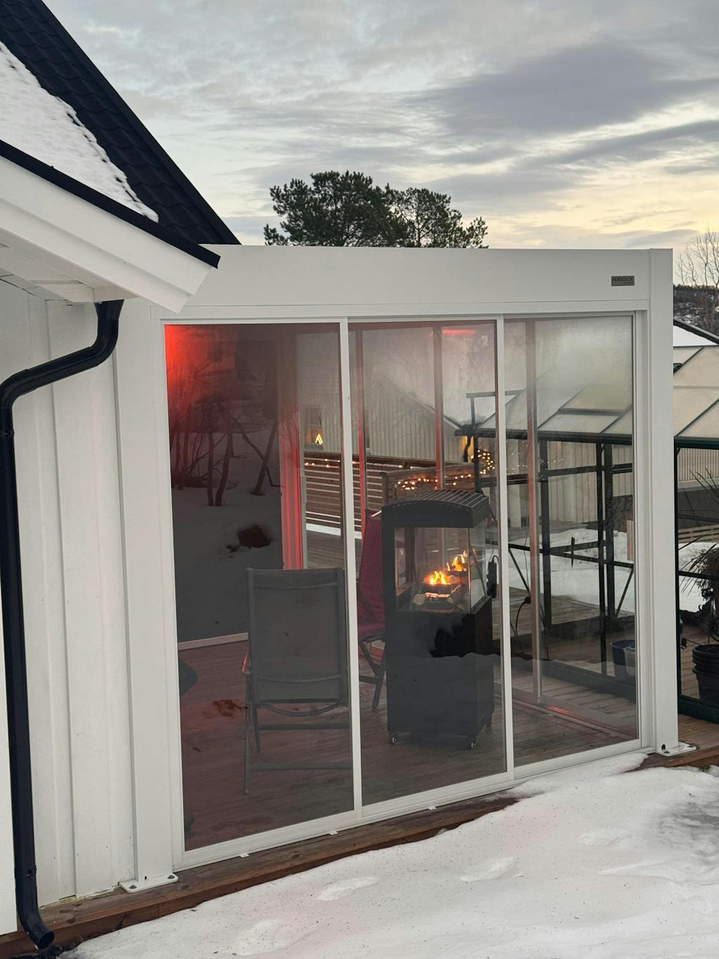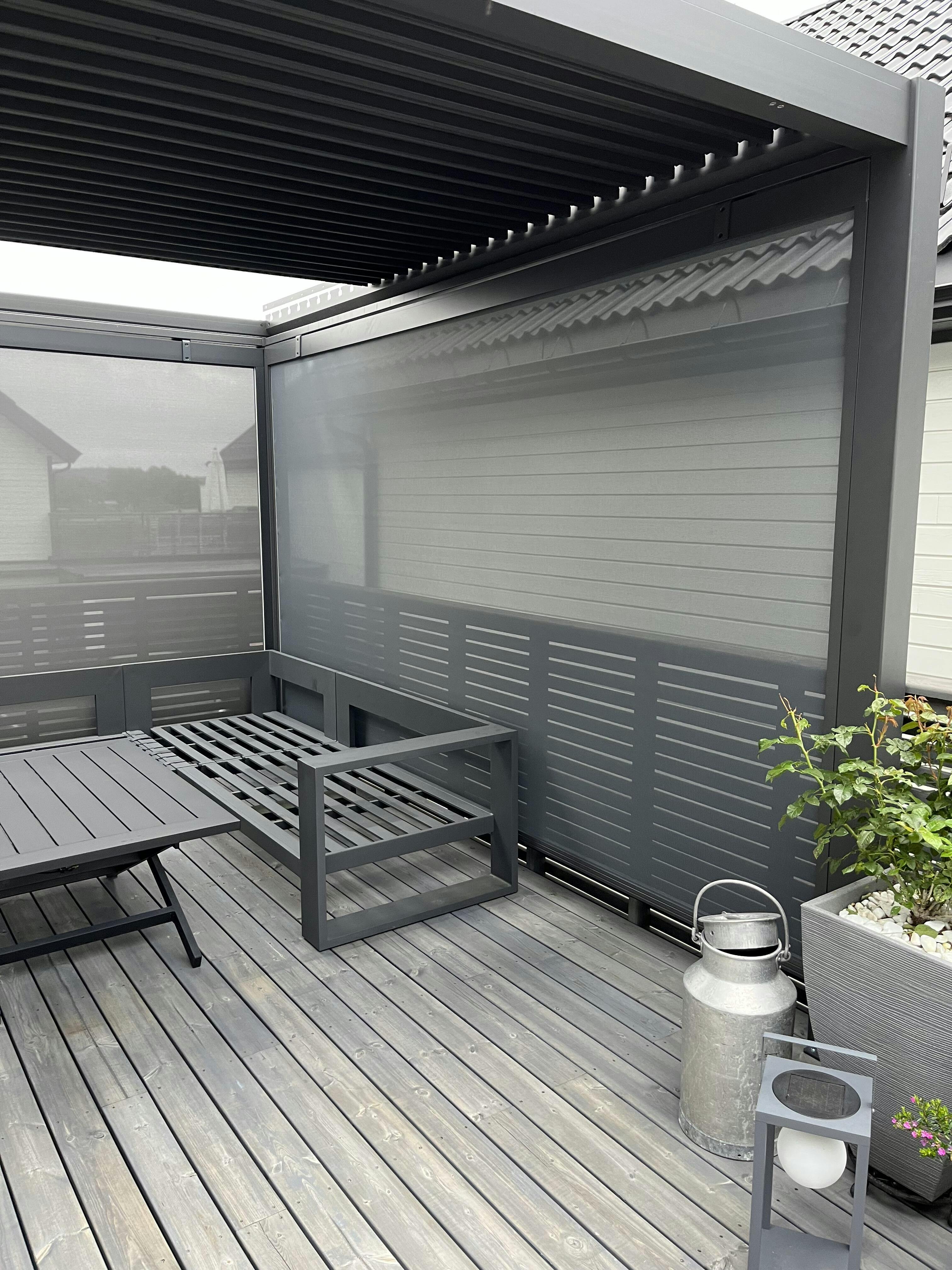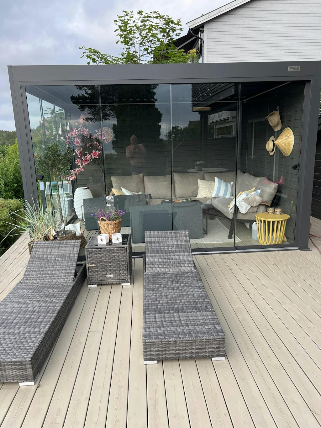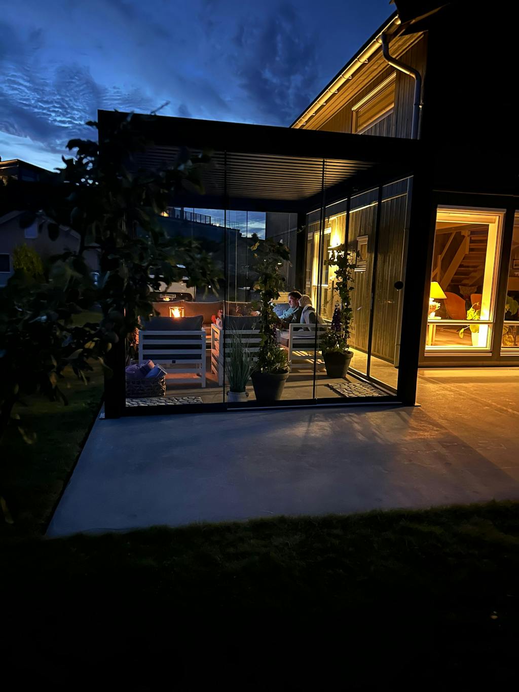 Etter at vi først satte opp pergolaen om sommeren og kunne overbevise oss selv om kvaliteten, har vi nå kjøpt en fast glassvegg. Vi er begeistret over hvor godt gjennomtenkt alt er og at du kan legge til flere tilbehør når som helst.