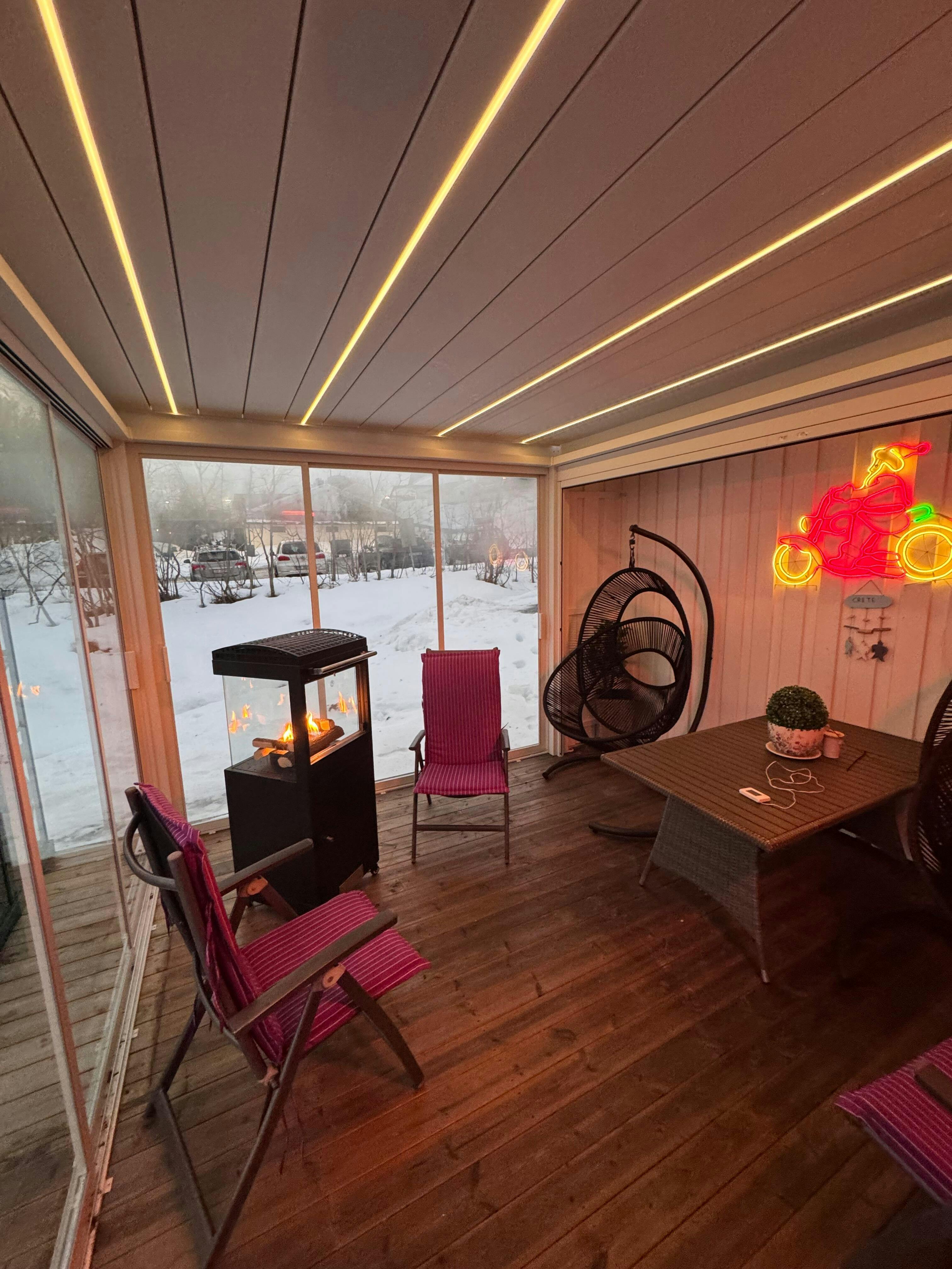 Ga uteplassen en vesentlig ansiktsløfting. Vi tok 4x4 med led og varme. Føles romslig og det er plass til mange. Vi bestilte montering via en samarbeidspartner. Det var nok lurt for det tok tid for to mann som var erfarne. En god investering.